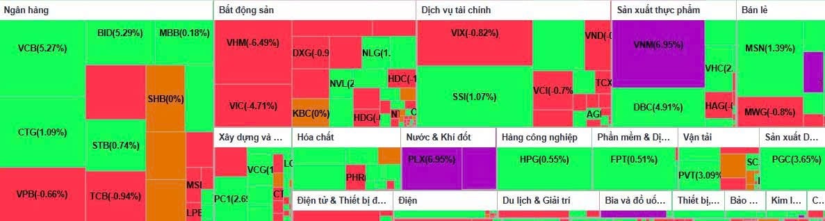 Bên cạnh đó, các cổ phiếu tiêu dùng và năng lượng như VNM, SAB, GAS và PLX đồng loạt tăng trần, trong đó VNM ghi nhận thanh khoản cao và dư mua giá trần lớn, cho thấy lực cầu mạnh mẽ ở vùng giá cao.