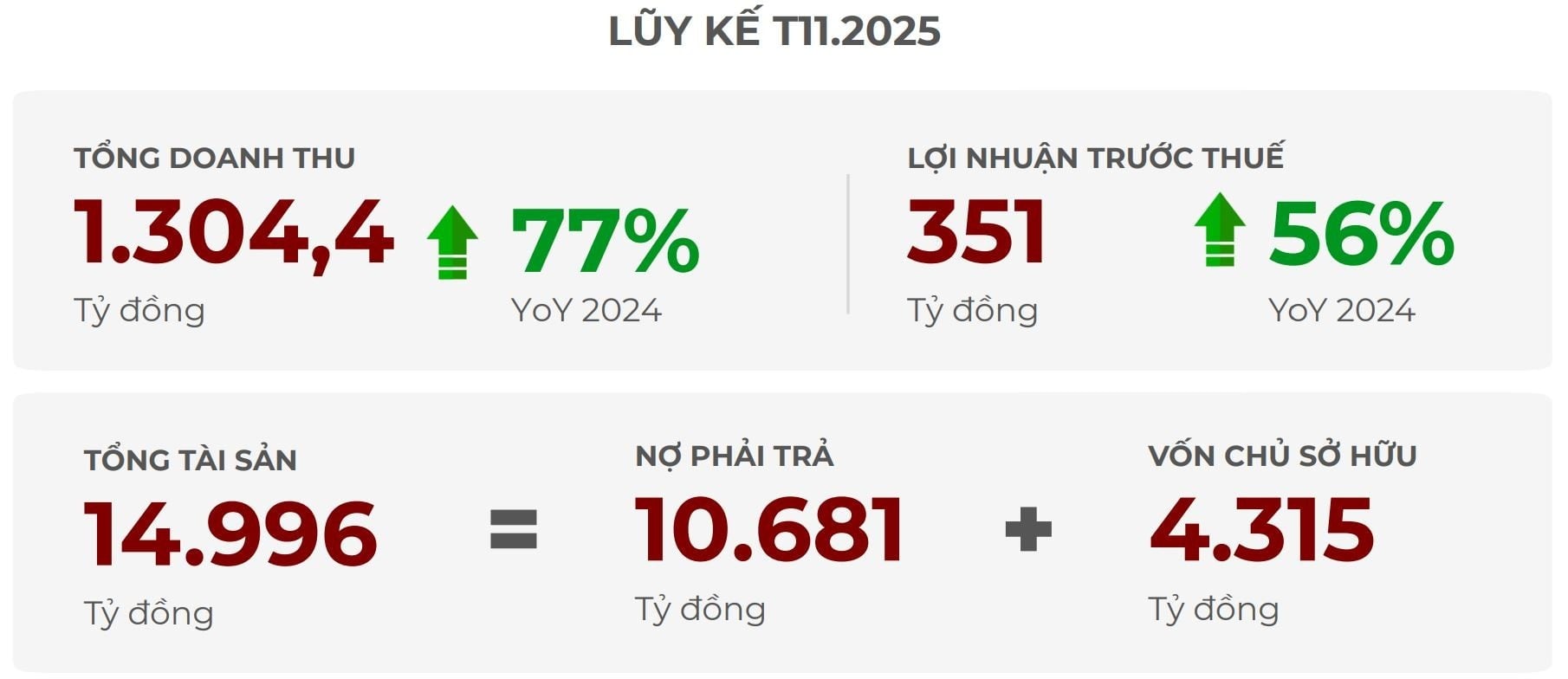 Trong thư gửi cổ đông công bố ngày 11/12, Công ty CP Chứng khoán DNSE (HOSE: DSE) cho biết hoạt động kinh doanh 11 tháng đầu năm 2025 ghi nhận bước tiến mạnh mẽ với doanh thu đạt 1.304,4 tỷ đồng, còn lợi nhuận trước thuế đạt 351 tỷ đồng, lần lượt cao hơn 77% và 56% so với cùng kỳ năm trước, phản ánh tốc độ mở rộng nhanh của doanh nghiệp trong giai đoạn thị trường sôi động trở lại.