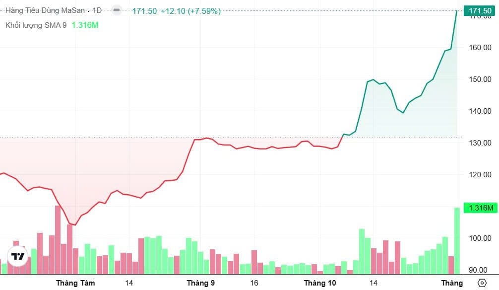 Đây đã là phiên tăng thứ 10 liên tiếp của MCH, nâng mức tăng giá trong ba tháng qua lên tới 66%. Với đà tăng này, vốn hóa Masan Consumer đạt gần 185.000 tỷ đồng, cao hơn nhiều doanh nghiệp niêm yết lớn như Vinamilk, PV Gas, GVR, ACB hay STB và thậm chí vượt cả công ty mẹ Masan Group.