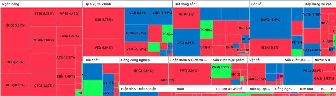 (Banker.vn) VN-Index lao dốc hơn 56 điểm trong phiên đầu tuần khi lực bán lan rộng trên toàn thị trường, kéo hàng loạt cổ phiếu vốn hóa lớn, bất động sản và chứng khoán chìm sâu trong sắc đỏ.