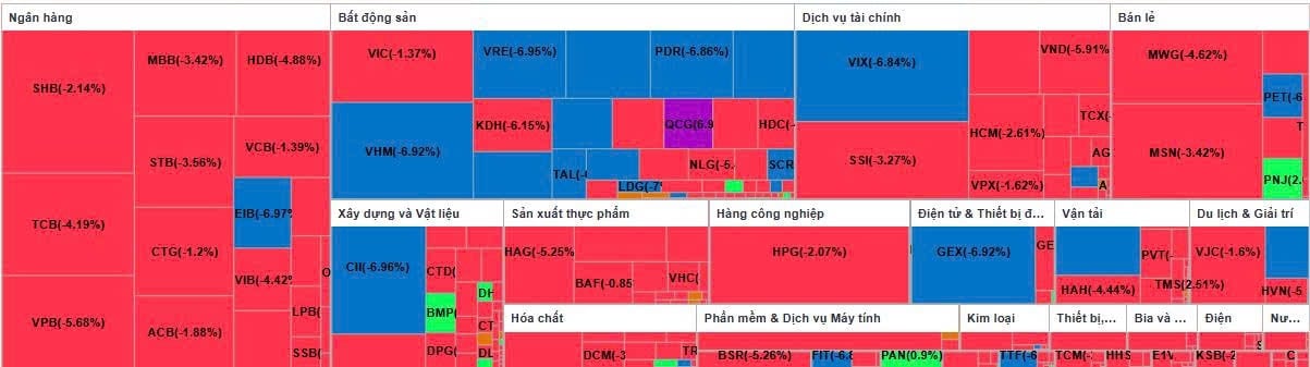 Diễn biến tiêu cực lan rộng trong nhóm bluechip, khi VPB giảm 5,7%, GVR mất hơn 5%, cùng loạt cổ phiếu lớn như SSI, MSN, MBB, STB, TCB, SAB, VIB, MWG, HDB đồng loạt lùi 3-5%. Sắc đỏ áp đảo khiến chỉ số gần như không còn lực nâng đỡ.