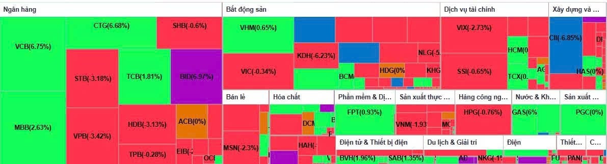 Tâm điểm của phiên giao dịch tiếp tục thuộc về nhóm cổ phiếu ngân hàng. Các mã vốn hóa lớn như BID, VCB và CTG đồng loạt tăng mạnh, đóng vai trò dẫn dắt chỉ số. Dòng tiền tập trung vào nhóm ngân hàng quốc doanh cho thấy xu hướng ưu tiên các cổ phiếu có nền tảng cơ bản tốt, thanh khoản cao và khả năng hưởng lợi từ môi trường vĩ mô ổn định. Tuy nhiên, không phải toàn bộ nhóm ngân hàng đều khởi sắc khi một số mã chịu áp lực điều chỉnh do hoạt động chốt lời ngắn hạn.