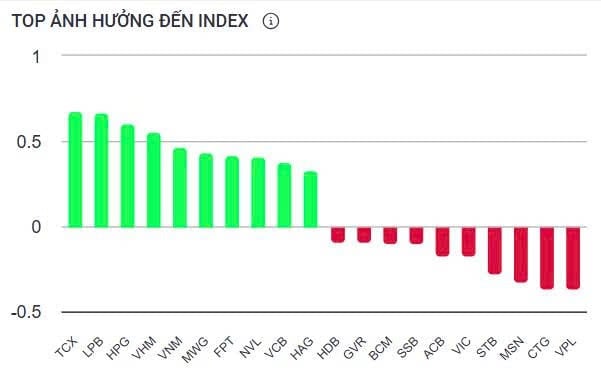 Diễn biến trong phiên 14/11 cho thấy sự phân hóa mạnh ở nhóm vốn hóa lớn. Dù vậy, biên độ biến động của phần lớn các mã trong VN30 lại khá hẹp. LPB dẫn đầu đà tăng khi nhích hơn 2% lên 49.900 đồng/cp. Theo sau là FPT, HPG, VNM và MWG, cùng tăng quanh mức 1%–1,5%. Ở chiều giảm, MSN và STB là hai cái tên gây chú ý nhất nhưng mức giảm chỉ hơn 1%.