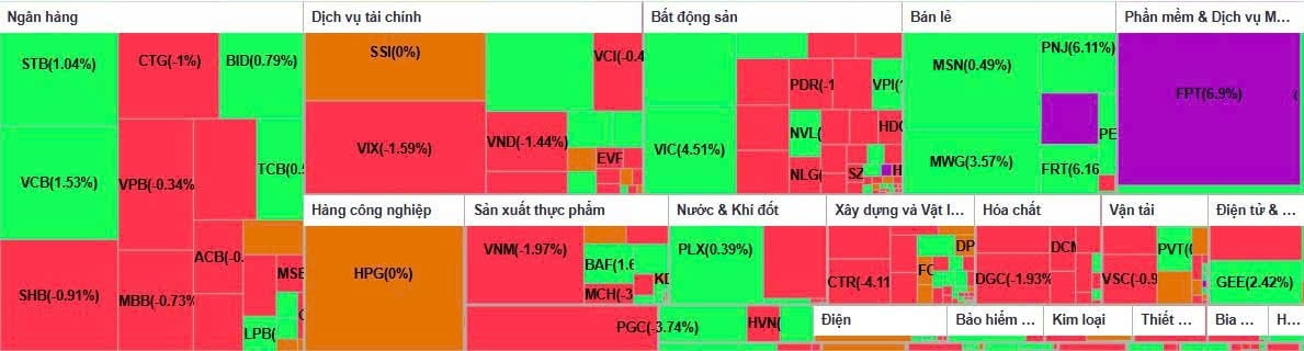 Bên cạnh đó, FPT tiếp tục là điểm sáng nổi bật trong rổ bluechip khi giữ nguyên sắc tím +6,9% lên 105.300 đồng, khớp lệnh gần 24 triệu cổ phiếu và còn dư mua trần hơn 4,3 triệu đơn vị. MWG cũng giao dịch tích cực khi tăng 3,6% lên 87.000 đồng. Trong khi đó, nhóm ngân hàng lớn hạ nhiệt, với TCB, BID, STB, VCB chỉ còn tăng nhẹ quanh mức 1%.