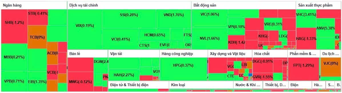 Ở chiều giảm, sắc đỏ vẫn chiếm ưu thế với 186 mã hạ nhiệt. Tuy nhiên đa phần chỉ điều chỉnh nhẹ dưới 1%, ngoại trừ STB giảm 2,5% xuống 50.000 đồng. Một số mã lớn như HPG, SAB và GAS giảm hơn 1%, tạo lực cản nhất định lên chỉ số.