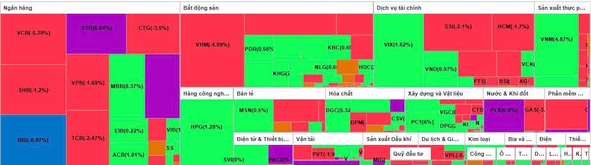 Nhóm VN30 là tác nhân chính kéo thị trường đi xuống khi chỉ số giảm gần 20 điểm, với 17 mã giảm và 13 mã tăng. Trong đó, bốn cổ phiếu trụ BID, VCB, VHM và VIC gây ảnh hưởng tiêu cực nhất, lấy đi tổng cộng 29,5 điểm của VN-Index. Ngược lại, HDB, PLX và STB trở thành điểm sáng hiếm hoi trong rổ khi đóng cửa tăng kịch trần, giúp hạn chế phần nào đà giảm của chỉ số.