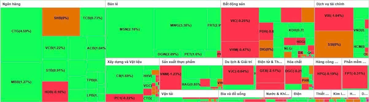 Tâm điểm sáng nay thuộc về nhóm ngân hàng khi sắc xanh lan tỏa rộng. CTG là nhân tố nổi bật nhất, tăng gần 4,6% lên 51.300 đồng, đóng góp đáng kể cho chỉ số chung. BID tăng hơn 2%, MSB tăng gần 2%, trong khi NAB, LPB, SSB, MBB, OCB, VCB và ACB đều tăng quanh mức 1% hoặc hơn. Nhóm ngân hàng trở thành điểm tựa quan trọng, mang về hơn 6 điểm cho VN-Index, trong khi nhóm cổ phiếu gây sức ép chỉ lấy đi của chỉ số chưa tới 3 điểm.