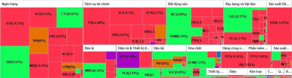 Cùng với DGC, STB cũng gây chú ý khi giảm mạnh 4,7% xuống 64.000 đồng/cổ phiếu, với hơn 9,4 triệu đơn vị được khớp lệnh. Nhiều mã bluechip khác như FPT, MSN, HDB và SSI cũng lùi từ 1% đến 2%, góp phần khiến diễn biến thị trường trở nên kém tích cực hơn về cuối phiên sáng.