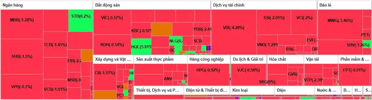 Trong rổ VN30, sắc đỏ chiếm ưu thế tuyệt đối, chỉ còn STB nhích nhẹ và LPB giữ được tham chiếu. Phần lớn các cổ phiếu vốn hóa lớn đều giảm trên dưới 1%, ngoại trừ một vài trường hợp như MWG mất 3,5%, SSI và HDB giảm quanh 2%. Dù giảm, nhóm ngân hàng vẫn dẫn đầu về thanh khoản, với HPG, MBB và SHB ghi nhận khối lượng khớp từ 11 đến hơn 21 triệu cổ phiếu.