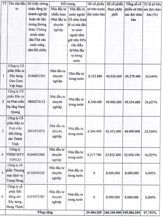 Danh sách nhà đầu tư tham gia đợt phát hành gồm 6 pháp nhân trong nước. Trong đó, Công ty CP Đầu tư và Phát triển Hạ tầng Nam Quang mua hơn 40,9 triệu cổ phiếu; Công ty CP Đầu tư Phát triển Bất động sản Thành Vinh mua khoảng 42,4 triệu cổ phiếu; Công ty CP Đầu tư xây dựng Gen Cons Việt Nam mua hơn 40,9 triệu cổ phiếu; Công ty TNHH MTV Vipico mua 25,8 triệu cổ phiếu. Hai nhà đầu tư còn lại là Công ty CP Thương mại Dịch vụ Trọng Hưng và Công ty CP Bất động sản Hưng Thịnh, mỗi đơn vị mua 8 triệu cổ phiếu.