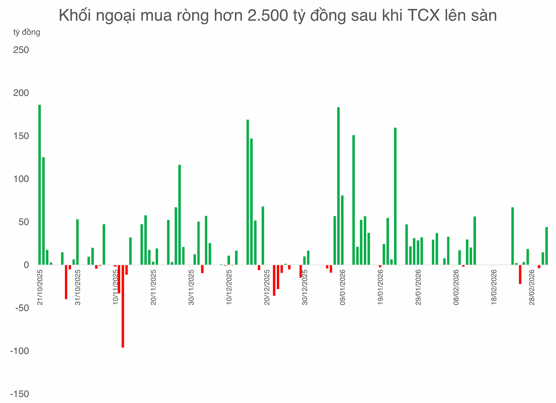Cùng với đó, từ đầu năm 2026, các nhà đầu tư ngoại đã mua ròng hơn 1.300 tỷ đồng, nằm trong Top 4 cổ phiếu được khối ngoại mua mạnh nhất toàn thị trường. Nếu tính từ ngày chào sàn, khối ngoại đang mua ròng TCX trên 2.500 tỷ đồng.