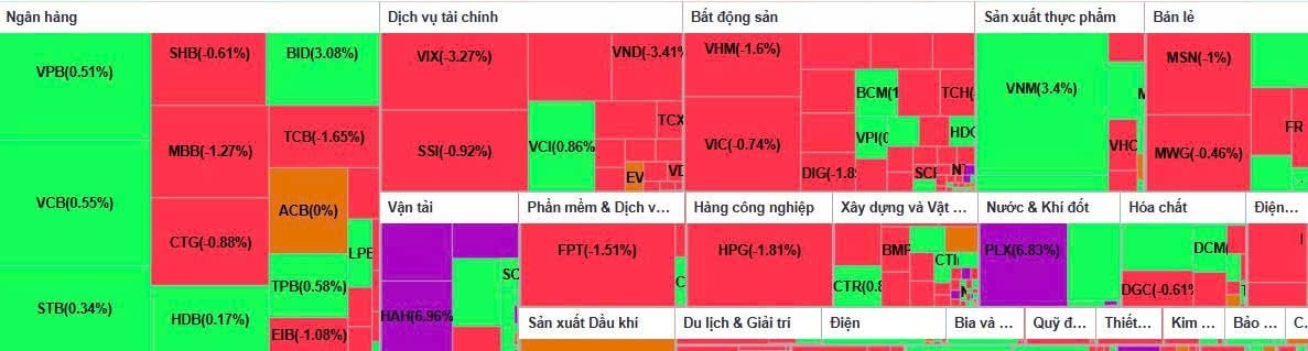 Kết phiên, PLX giữ được đà tăng mạnh 6,1% lên 59.000 đồng/cp, trong khi GVR và VNM thu hẹp biên độ, lần lượt tăng 2,6% và 4%. Các cổ phiếu lớn khác như LPB, BID và SAB tăng quanh 2%, còn nhóm ngân hàng nhìn chung giao dịch thận trọng với mức tăng nhẹ ở SHB, VPB, VCB hay HDB.