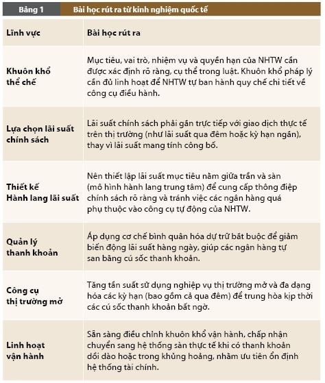 Các bài học này bao quát từ phương diện thể chế, pháp lý cho đến thiết kế và vận hành các công cụ điều hành trên thị trường tiền tệ; được hệ thống hóa và tóm lược trong Bảng 1 theo từng lĩnh vực trọng tâm của khuôn khổ điều hành CSTT. (Bảng 1)