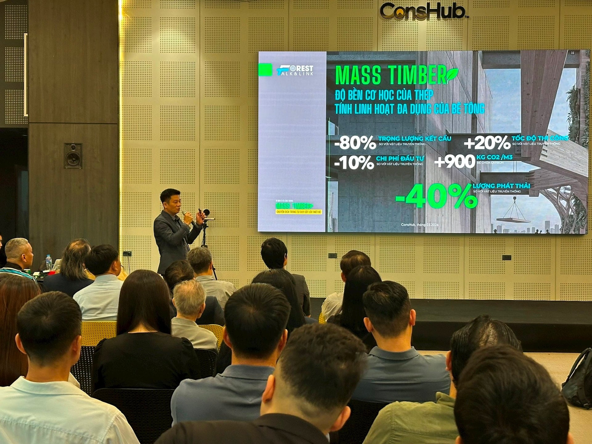 Kiến trúc sư Tạ Đức Quang – Tổng Giám đốc ConsMedia đặc biệt nhấn mạnh Mass Timber. Đây là gỗ khối/gỗ kỹ thuật quy mô lớn, là loại vật liệu xây dựng tiên tiến, được tạo ra bằng cách ép chặt, dán nhiều lớp gỗ nhỏ thành các tấm, cột hoặc dầm lớn. Đây là giải pháp thay thế bền vững cho bê tông và thép, giúp lưu trữ carbon, chịu lực cao, thi công nhanh và mang lại thẩm mỹ độc đáo cho các công trình cao tầng.