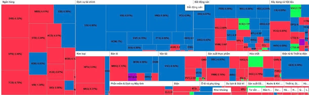 Dù chỉ số giảm sâu, nhưng thị trường lại lập kỷ lục mới về thanh khoản. Tổng giá trị giao dịch toàn thị trường đạt 80.220 tỷ đồng (gần 3,1 tỷ USD), tương đương hơn 3,25 tỷ cổ phiếu – mức cao nhất trong lịch sử 25 năm hoạt động của thị trường chứng khoán Việt Nam. Riêng sàn HOSE ghi nhận giá trị khớp lệnh gần 71.241 tỷ đồng, tăng hơn 60% so với phiên trước và gấp hơn 2 lần so với mức trung bình 20 phiên gần nhất.