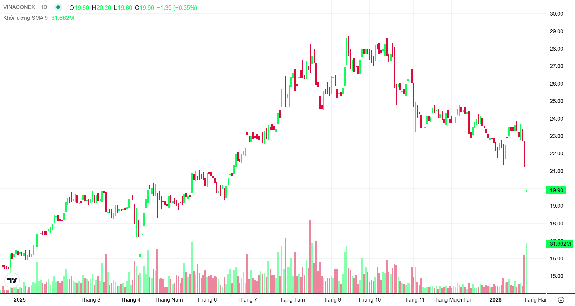 margin: 15px auto;" />So với vùng đỉnh thiết lập vào tháng 9/2025, thị giá VCG hiện đã giảm khoảng 30%. Diễn biến này xuất hiện trong bối cảnh kết quả kinh doanh năm 2025 của Vinaconex ghi nhận mức tăng trưởng lợi nhuận đột biến, tạo nên sự đối lập đáng chú ý giữa thị trường chứng khoán và các chỉ tiêu tài chính đã công bố.