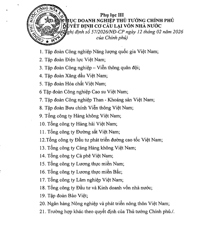 Danh mục 20 doanh nghiệp do Thủ tướng quyết định cơ cấu lại vốn nhà nước, gồm: Tập đoàn Công nghiệp Năng lượng Quốc gia Việt Nam (PVN); Tập đoàn Điện lực Việt Nam (EVN); Viettel; Petrolimex; Tập đoàn Hóa chất Việt Nam; Tập đoàn Công nghiệp Cao su Việt Nam (GVR); Tập đoàn Công nghiệp Than - Khoáng sản Việt Nam (TKV); Tập đoàn Bưu chính Viễn thông Việt Nam (VNPT); Tổng Công ty Hàng không Việt Nam (HVN); Tổng Công ty Hàng hải Việt Nam (MVN); Tổng Công ty Đường sắt Việt Nam; Tổng Công ty Đầu tư Phát triển Đường cao tốc Việt Nam; Tổng Công ty Cảng Hàng không Việt Nam (ACV); Tổng Công ty Cà phê Việt Nam; Tổng Công ty Lương thực miền Nam (VSF); Tổng Công ty Lương thực miền Bắc; Tổng Công ty Lâm nghiệp Việt Nam; Tổng Công ty Đầu tư và Kinh doanh vốn Nhà nước (SCIC); Tập đoàn Bảo Việt (BVH); Ngân hàng Nông nghiệp và Phát triển Nông thôn Việt Nam (Agribank).