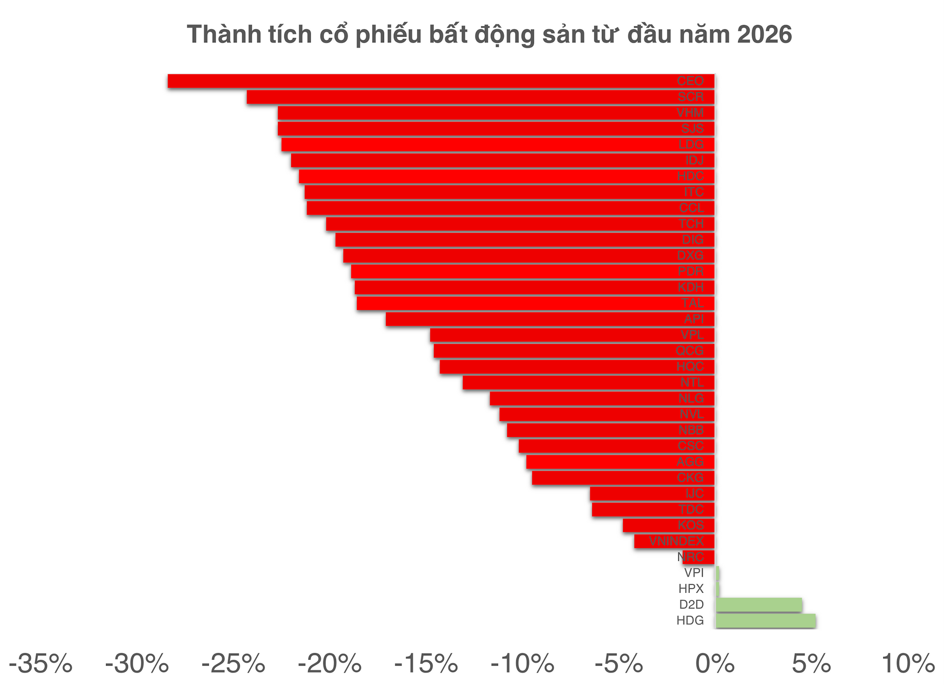 Đáng chú ý, nhiều cổ phiếu giảm sâu với mức giảm vượt xa biến động của VN-Index, chẳng hạn CEO giảm 28,4% tính từ đầu năm 2026. Còn SCR giảm 24,3%, SJS và VHM cùng giảm khoảng 22,7%.