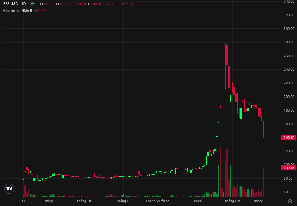 Kết thúc phiên giao dịch ngày 05/03/2026, cổ phiếu F88 của Công ty CP Đầu tư F88 (UPCoM) đóng cửa ở mức giá 140.100 đồng/cổ phiếu, ghi nhận mức giảm sàn 15%. Thanh khoản trong phiên chỉ ở mức khiêm tốn 15,35 tỷ đồng với hơn 109 nghìn cổ phiếu được sang tay. Đây cũng đã là phiên thứ sáu liên tiếp cổ phiếu F88 mất điểm.