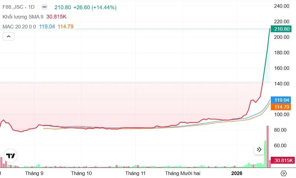 Kết thúc phiên giao dịch cuối tuần qua (23/1), cổ phiếu F88 tiếp tục đóng cửa trong sắc tím tại mức 211.800 đồng/cổ phiếu, tương ứng mức tăng gần 15% so với tham chiếu. Đây là phiên tăng trần thứ tư liên tiếp kể từ khi cổ phiếu được điều chỉnh giá kỹ thuật vào ngày 20/1. Nếu tính trong vòng 5 phiên gần nhất, thị giá F88 đã tăng hơn gấp đôi, lên tới khoảng 111%.