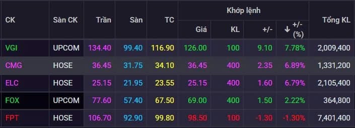 margin: 15px auto;" />Ngay từ đầu phiên, dòng tiền đã tập trung rõ nét vào nhiều mã thuộc nhóm này. Cổ phiếu ELC và CMG tăng kịch trần, đóng cửa trong trạng thái trắng bên bán. Thanh khoản tại hai mã này cải thiện đáng kể so với các phiên trước, cho thấy lực cầu chủ động tham gia ngay cả khi thị trường chung đang suy yếu.