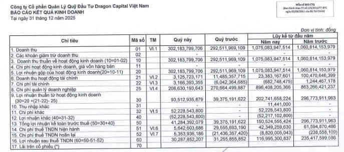 Theo đó, kết thúc năm tài chính 2025 Dragon Capital ghi nhận tổng doanh thu thuần đạt 1.075,08 tỷ đồng, tăng nhẹ 1,35% so với mức 1.060,81 tỷ đồng của năm trước. Riêng trong quý IV, doanh thu đạt 302,18 tỷ đồng, duy trì sự ổn định so với cùng kỳ.