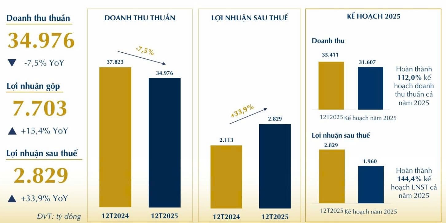 Cụ thể, doanh thu thuần cả năm đạt 34.976 tỷ đồng, giảm 7,5% so với năm 2024. Nguyên nhân chủ yếu đến từ sự sụt giảm mạnh của mảng kinh doanh vàng 24K, vốn chịu ảnh hưởng kéo dài bởi tình trạng khan hiếm nguồn nguyên liệu và hạn chế nguồn cung sản phẩm.