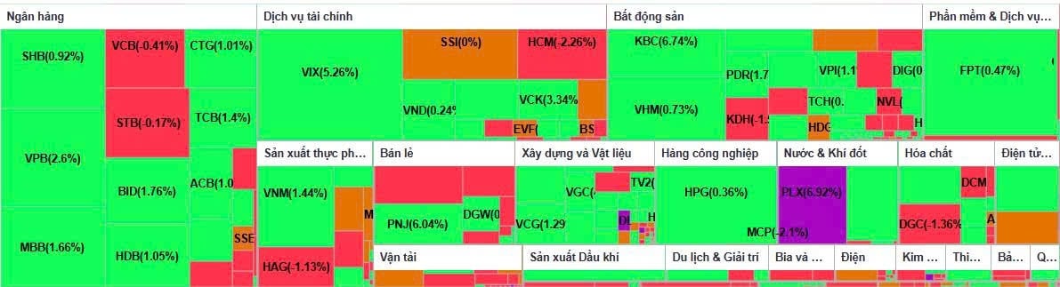 Nhóm cổ phiếu họ Vin quay lại vai trò dẫn dắt, trong đó VIC tăng 1,3% và là mã đóng góp lớn nhất cho VN-Index với khoảng 3,5 điểm. Các mã khác như VHM và VRE giao dịch ổn định hơn.