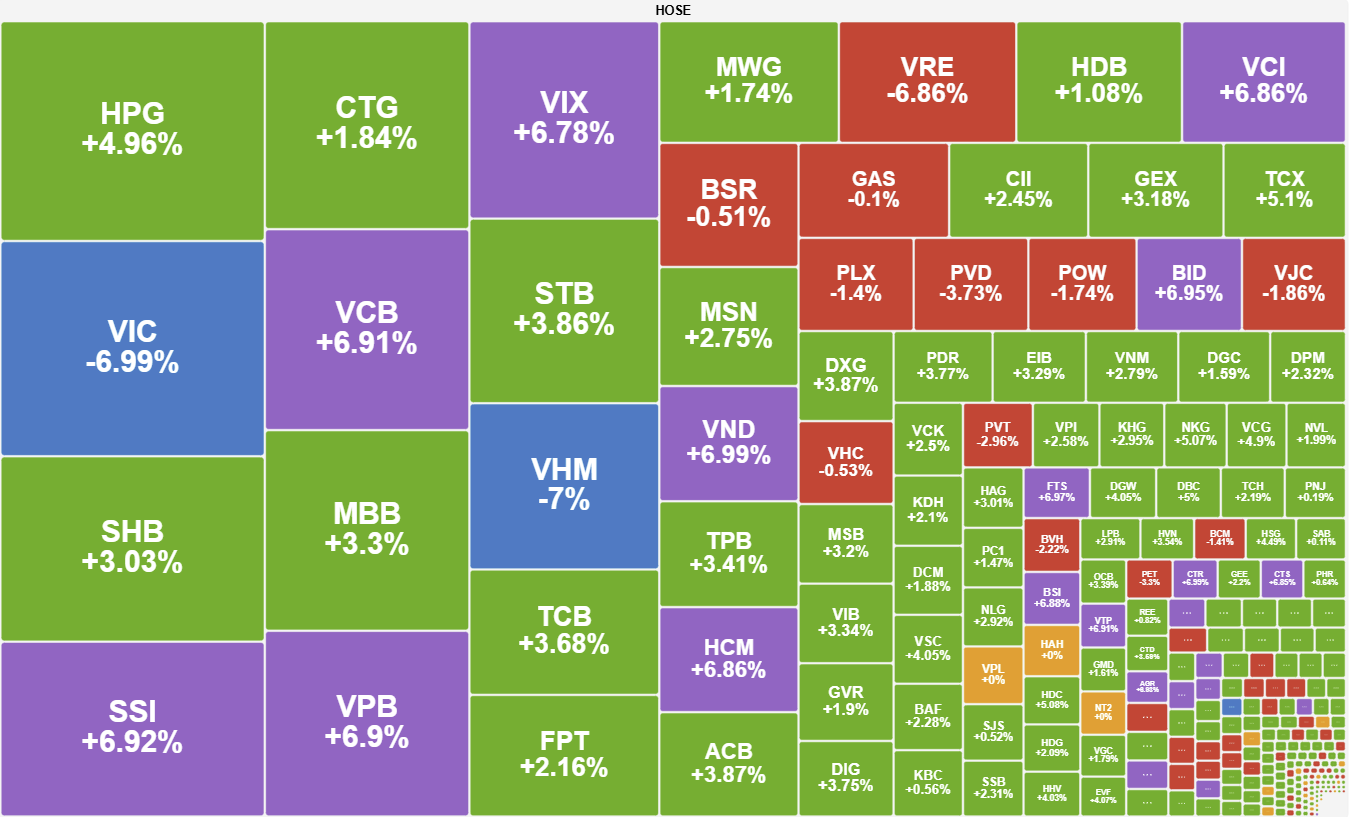 Điểm sáng rực rỡ nhất phiên sáng là màn trình diễn của VCB, BID và hàng loạt mã chứng khoán như SSI, VND, HCM, VIX khi đồng loạt chạm mức giá trần. Đáng chú ý, thanh khoản vọt tăng hơn 40%, xác nhận dòng tiền vào cuộc quyết liệt.