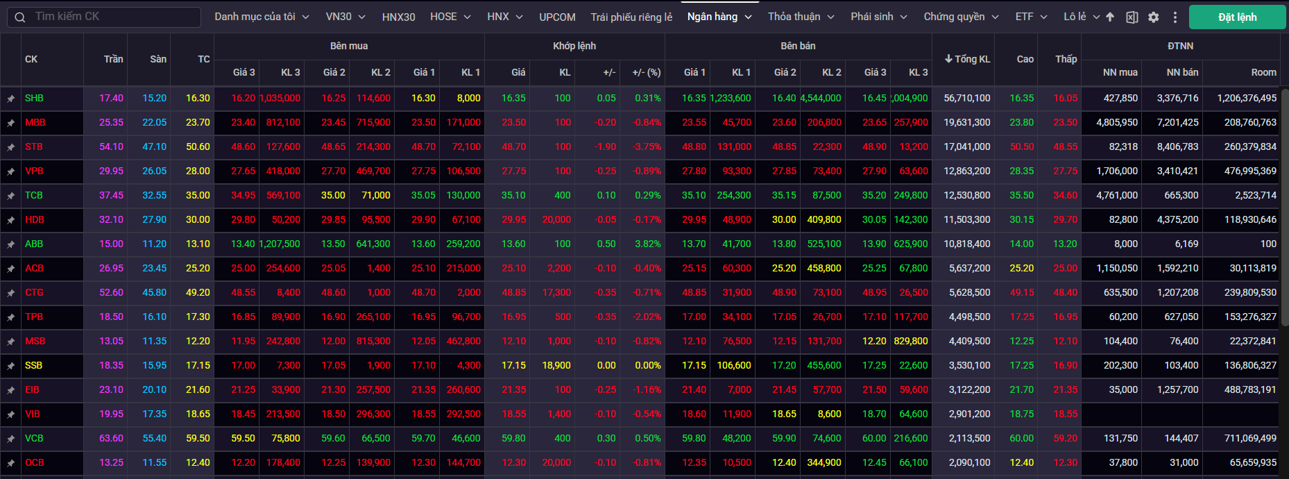 Dù vậy, sắc đỏ vẫn chiếm ưu thế rõ rệt trên bảng điện tử. Khối ngoại tiếp tục bán ròng ở nhiều mã ngân hàng như CTG, MBB, STB và SHB, tạo thêm áp lực cho thị trường trong phiên chiều.
