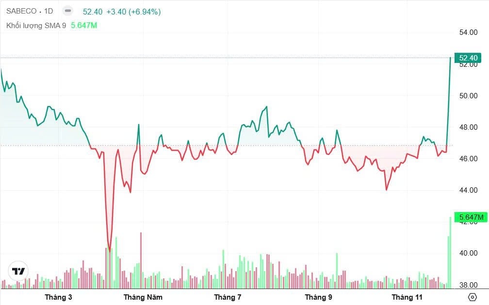 Đây đã là phiên tăng mạnh thứ hai liên tiếp. Trước đó một ngày, SAB cũng ghi nhận mức tăng 5,6% lên 49.000 đồng/cp. Tính gộp hai phiên, thị giá đã nhảy vọt hơn 12%, tương ứng tăng thêm khoảng 6.000 đồng mỗi cổ phiếu.