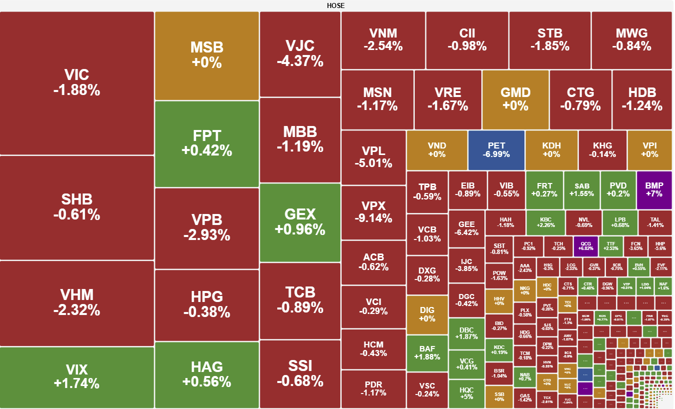 Kết thúc phiên giao dịch, sàn HOSE có 104 mã tăng và 192 mã giảm, VN-Index giảm 20,08 điểm (-1,17%), xuống 1.698,9 điểm. Tổng khối lượng giao dịch đạt hơn 592,5 triệu đơn vị, giá trị đạt 16.224,3 tỷ đồng, giảm 8% về khối lượng và 18% về giá trị so với phiên hôm qua. Giao dịch thỏa thuận đóng góp hơn 95,3 triệu đơn vị, giá trị đạt 2.585 tỷ đồng.