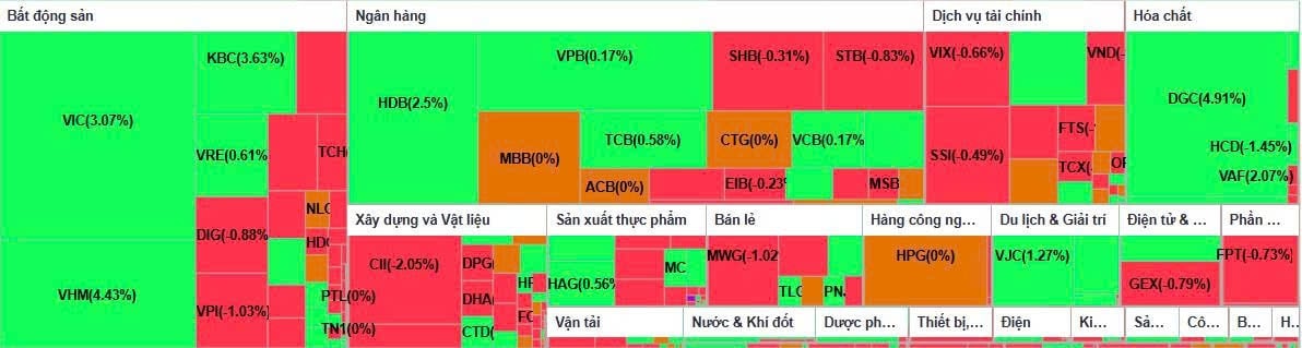 Ở nhóm bất động sản, ngoài các mã trụ, một số cổ phiếu ghi nhận diễn biến tích cực như KBC tăng hơn 3,6% và LDG tăng trên 3%, trong khi phần lớn các mã còn lại dao động trong biên độ hẹp. Nhóm ngân hàng giao dịch phân hóa, với HDBank (HDB) tăng mạnh nhất 2,5%, còn lại chỉ biến động nhẹ quanh tham chiếu.