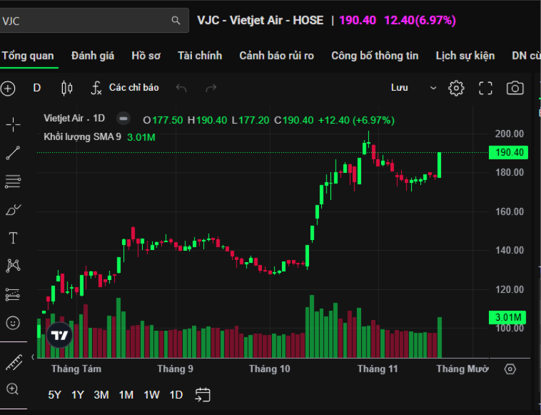 Trong suốt phiên 20/11, VJC ghi nhận diễn biến tích cực ngay từ những phút đầu và nhanh chóng tăng hết biên độ, đóng cửa ở mức 190.400 đồng/cổ phiếu, vùng giá cao nhất kể từ cuối tháng 10. Mã này thường xuyên rơi vào tình trạng “trắng” bên bán vào buổi chiều, cho thấy lực cầu áp đảo mạnh mẽ.
