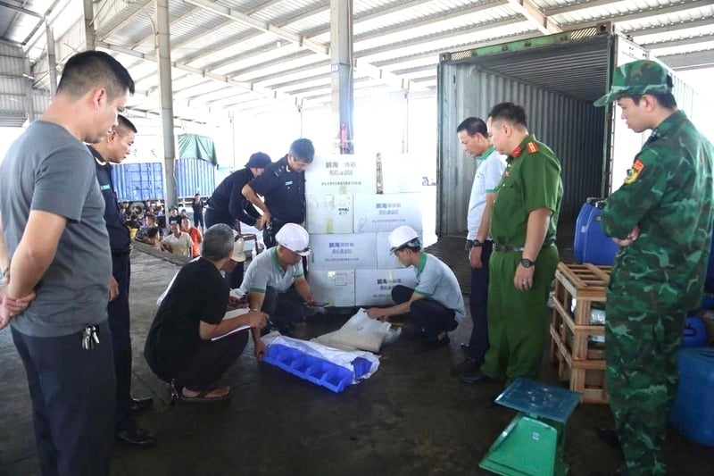 Công an tỉnh Quảng kiểm hóa hàng hóa đối với 19/28 container (kiểm tra, đối chiếu hàng hóa trong container với tờ khai nhập khẩu đi kèm) xác định ngoài hàng hóa trong danh mục tờ khai nhập khẩu, các đối tượng đã xen kẹp, trà trộn từ 30% đến 70% hàng nhập lậu. Ảnh: Công an tỉnh Quảng Ninh