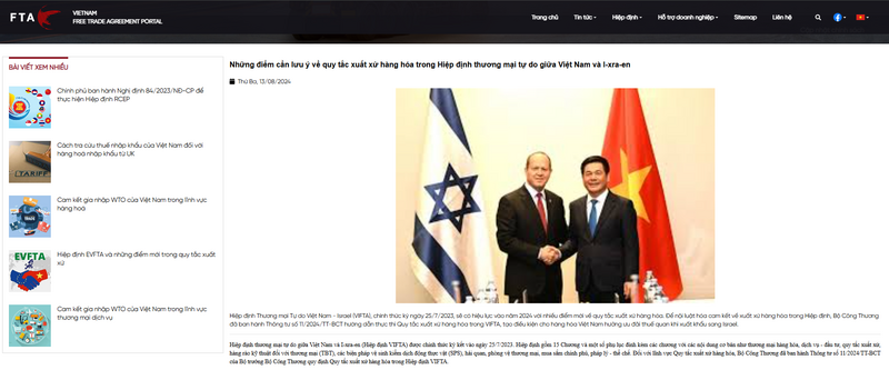 Theo đó, xuyên suốt thời gian qua, Vụ Chính sách thương mại đa biên, Bộ Công Thương - đơn vị được giao vận hành Cổng FTAP đã liên tục cập nhật và đăng tải những nội dung về Hiệp định VIFTA; cùng với đó, cập nhật thông tin về thị trường Israel để doanh nghiệp trong nước chủ động kế hoạch thực thi hiệp định và tiếp cận thị trường.