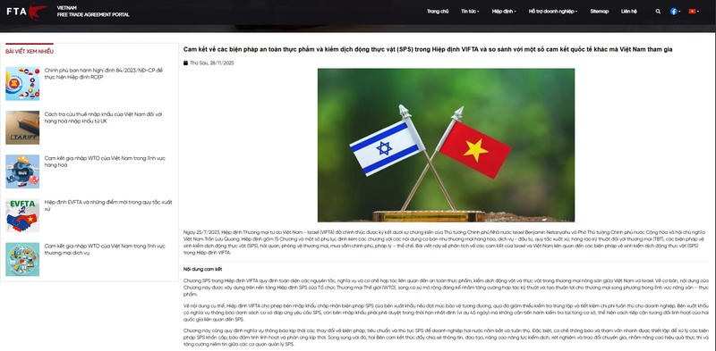 Mới đây nhất, ngày 28/11/2025, Vụ Chính sách thương mại đa biên, Bộ Công Thương đã đăng tải bài viết “Cam kết về các biện pháp an toàn thực phẩm và kiểm dịch động thực vật (SPS) trong Hiệp định VIFTA và so sánh với một số cam kết quốc tế khác mà Việt Nam tham gia”. Ngay sau khi được đăng tải, bài viết luôn nằm trong top được có lượng đọc lớn nhất, được truy cập nhiều nhất.