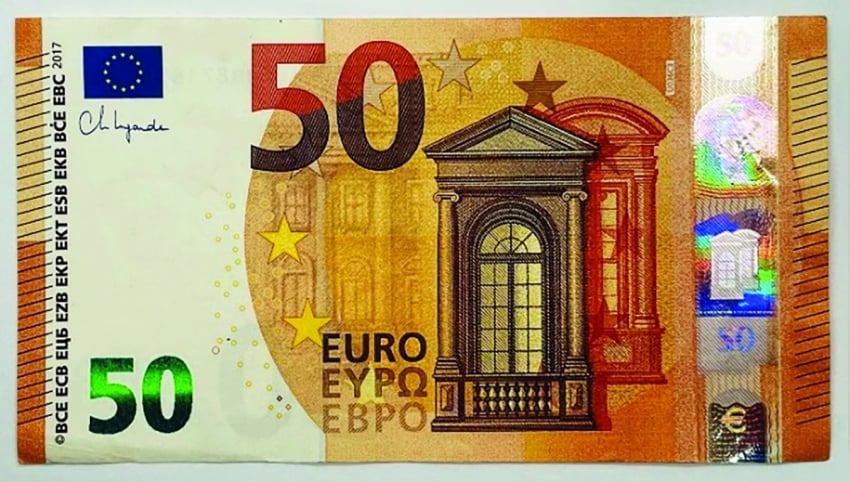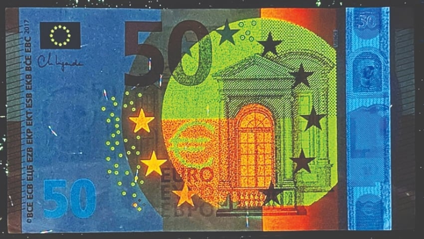 Hình 1: Đồng 50 Euro và ứng dụng bảo an của mực không màu phát quang