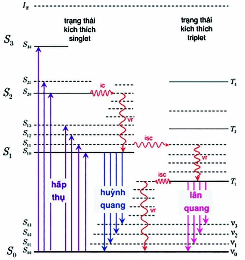 Khi phân tử hấp thụ photon, điện tử được kích thích từ trạng thái cơ bản singlet S₀ lên các trạng thái singlet kích thích như S₁ hoặc S₂. Sau đó, điện tử nhanh chóng mất năng lượng thông qua các quá trình không bức xạ, bao gồm thư giãn dao động, chuyển đổi nội hệ hoặc chuyển đổi liên hệ sang trạng thái triplet T₁. Khi điện tử quay trở về trạng thái cơ bản, năng lượng được giải phóng dưới dạng ánh sáng.