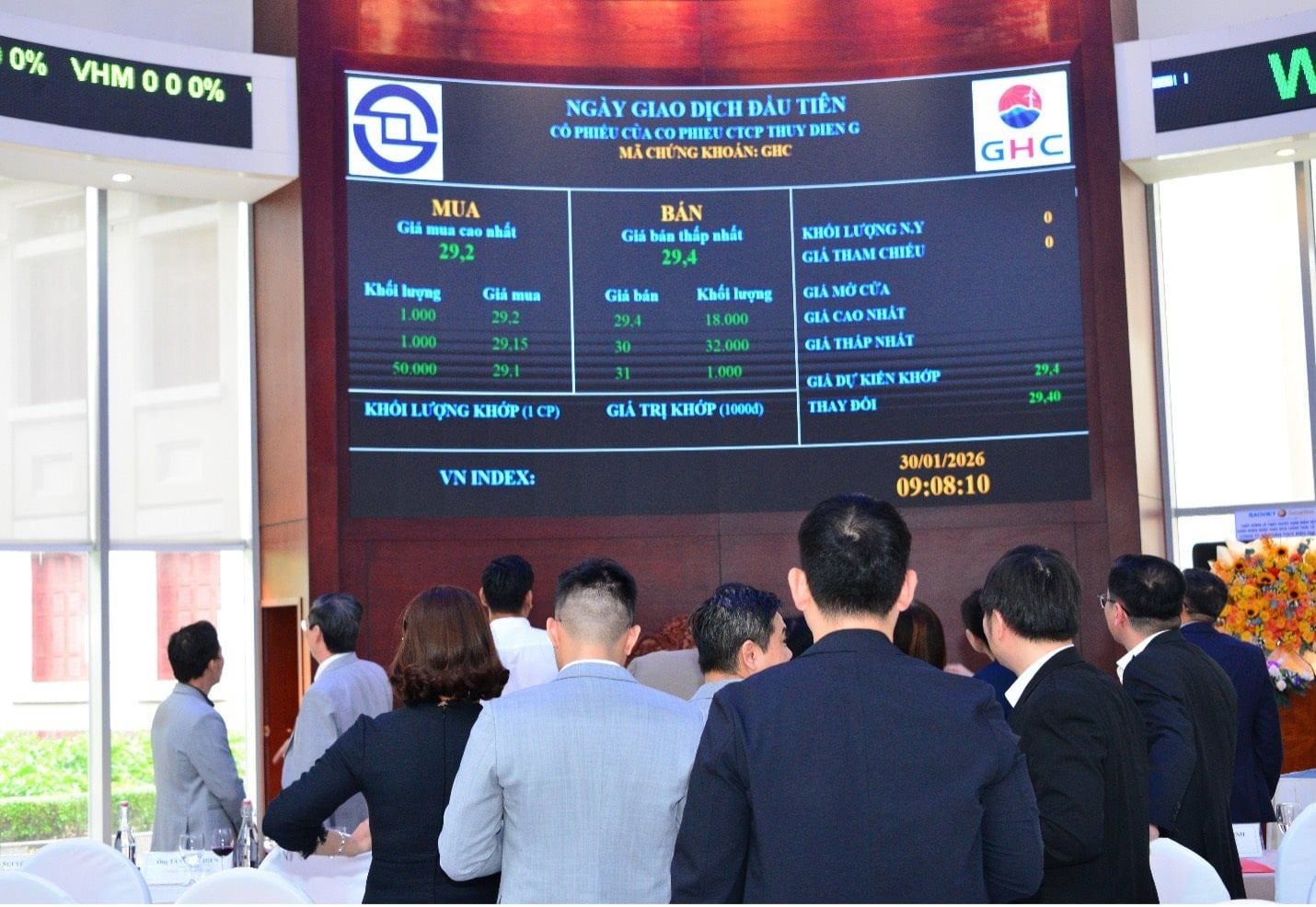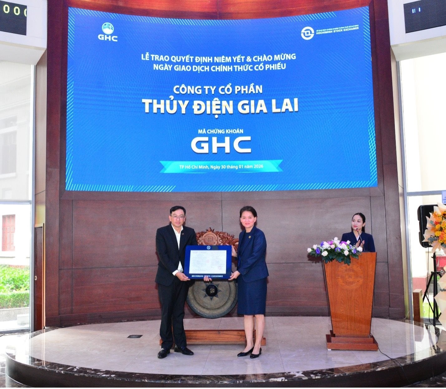 (Banker.vn) Ngày 30/1/2026, Sở Giao dịch Chứng khoán Thành phố Hồ Chí Minh (HOSE) tổ chức Lễ trao quyết định niêm yết cho Công ty Cổ phần Thủy điện Gia Lai (Mã chứng khoán: GHC) và đưa vào giao dịch chính thức 47.662.500 cổ phiếu GHC với tổng giá trị niêm yết (theo mệnh giá) là hơn 476.625.000.000 đồng.