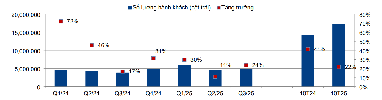 margin: 15px auto;" />Theo cập nhật, tổng lượng hành khách qua các cảng hàng không đạt 30,7 triệu lượt trong quý III/2025, tăng 8% so với cùng kỳ. Trong đó, khách quốc tế tăng mạnh 15% lên gần 11,7 triệu lượt, còn khách nội địa đạt 19 triệu lượt, tăng 5%. Tính chung 9 tháng, tổng lượng khách đạt 90,8 triệu lượt, tăng 9% so với cùng kỳ năm 2024, cho thấy nhu cầu đi lại vẫn duy trì đà ổn định.