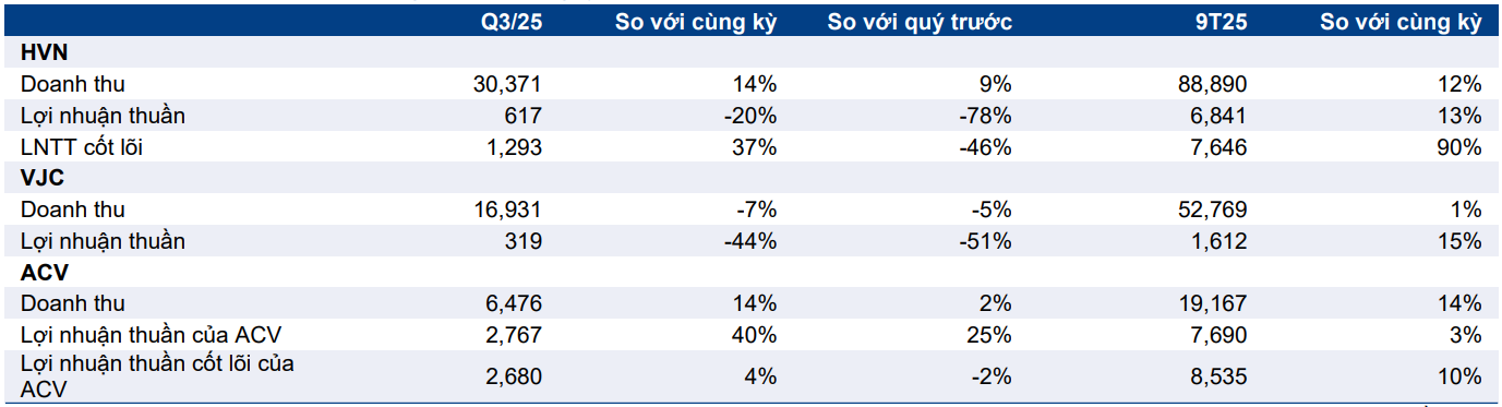 Trong nhóm ba doanh nghiệp lớn ngành hàng không gồm Vietnam Airlines (HVN), Vietjet (VJC) và Tổng công ty Cảng hàng không Việt Nam (ACV), kết quả kinh doanh quý III/2025 cho thấy sự phân hóa rõ rệt.