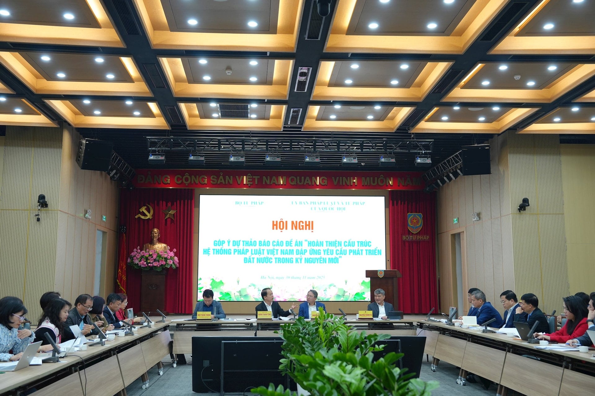 Tại Hội nghị, để tiếp tục hoàn thiện nội dung dự thảo Báo cáo, các đại biểu đại diện các cơ quan của Quốc hội, Bộ, ban, ngành, các chuyên gia tiếp tục cho ý kiến về dự thảo Đề án, trong đó tập trung vào 5 định hướng, 5 giải pháp hoàn thiện cấu trúc hình thức, 5 giải pháp hoàn thiện cấu trúc nội dung, 6 giải pháp về cơ chế vận hành; về việc phân chia 8 nhóm lĩnh vực pháp luật; về danh mục các văn bản luật dự kiến đề xuất nghiên cứu, ban hành mới giai đoạn 2026-2031 và sau năm 2031…