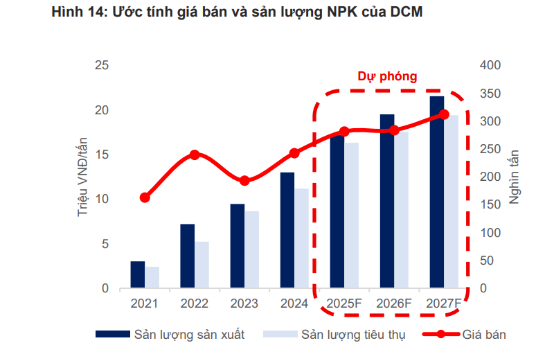 Nhờ tổng hòa các yếu tố thuận lợi từ giá bán cao, sản lượng tăng và chi phí đầu vào giảm, MBS dự báo lợi nhuận ròng của DCM đạt 2.194 tỷ đồng năm 2025 và 2.618 tỷ đồng năm 2026, tương ứng tăng trưởng 66,3% và 19,3% so với cùng kỳ. Đây là mức tăng trưởng cao nhất trong nhóm doanh nghiệp phân bón niêm yết hiện nay.
