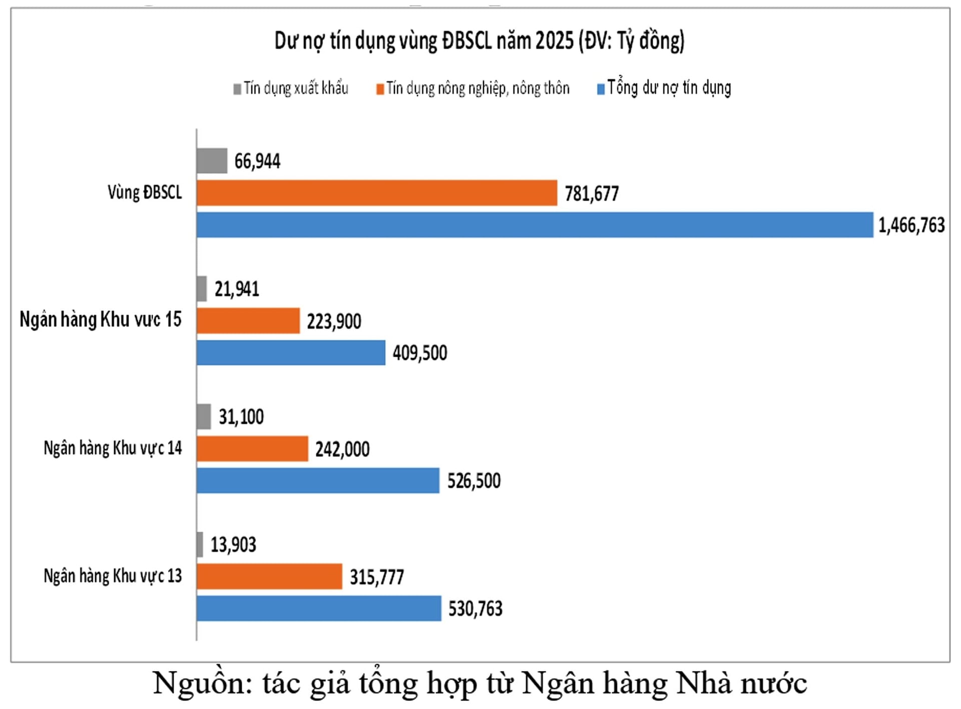 Số liệu từ Ngân hàng Nhà nước chi nhánh Khu vực 13, Khu vực 14 và Khu vực 15 cho thấy, quy mô dư nợ tín dụng toàn vùng ĐBSCL năm 2025 đạt xấp xỉ trên 1,2 triệu tỷ đồng, trong đó: Dư nợ cho vay nông nghiệp – nông thôn chiếm tỷ lệ lớn nhất, khoảng 45–50% tổng dư nợ, tương đương 540–600 nghìn tỷ đồng. Đây là mức tỷ lệ cao hơn bình quân cả nước, phản ánh rõ nét đặc thù kinh tế nông nghiệp của vùng.