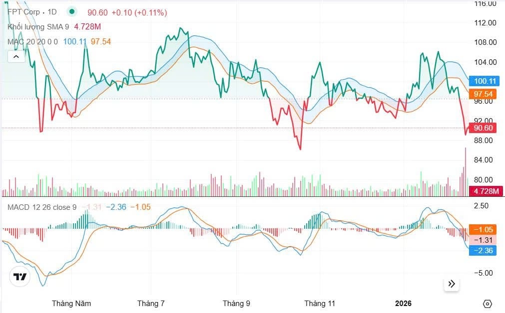 Cổ phiếu FPT đang cho thấy những tín hiệu hồi phục nhẹ sau nhịp điều chỉnh mạnh kéo dài gần một tháng. Phiên sáng 27/2, mã này tăng 0,33% lên 90.800 đồng/cổ phiếu, khớp lệnh hơn 4,5 triệu đơn vị. Trước đó một ngày, FPT cũng tăng gần 1,6% với thanh khoản vọt lên 17,5 triệu cổ phiếu, tương đương khoảng 1.590 tỷ đồng. Tuy nhiên, so với vùng giá đỉnh gần nhất, thị giá FPT vẫn thấp hơn khoảng 15%, phản ánh áp lực bán đáng kể trong ngắn hạn.