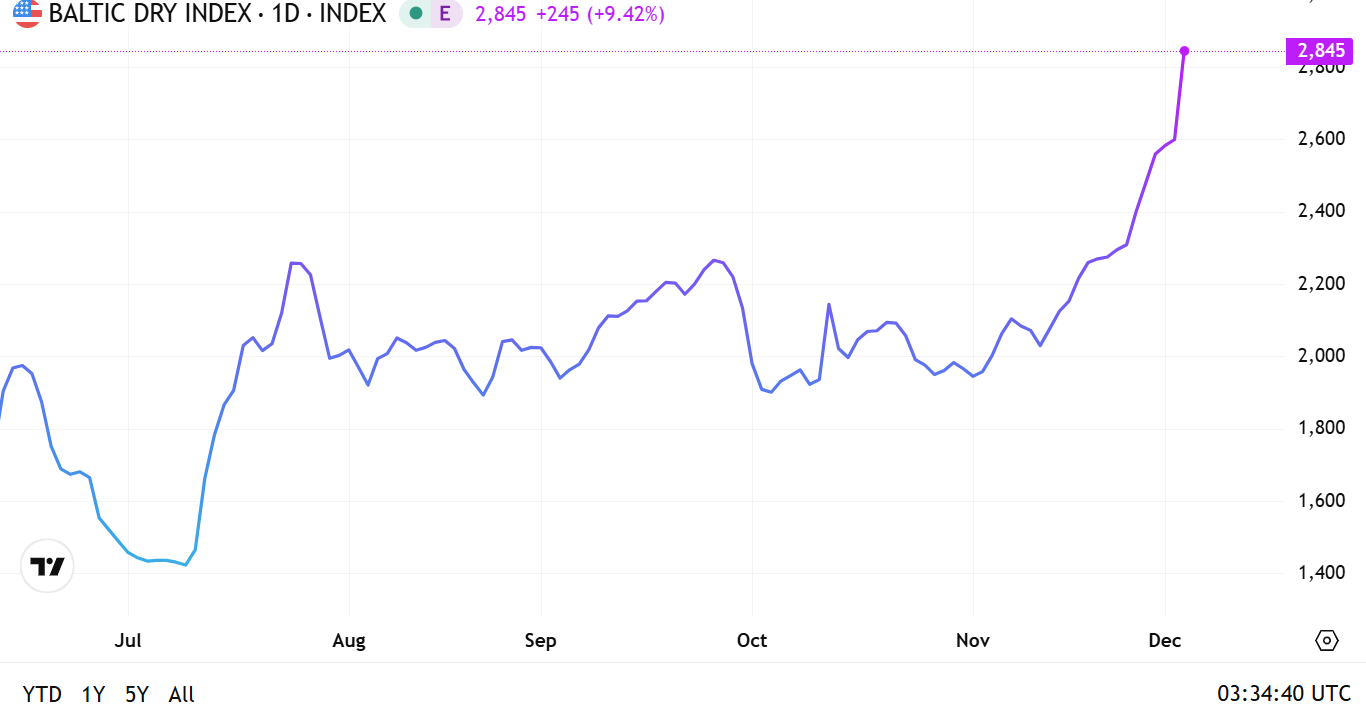 margin: 15px auto;" />Động lực tăng giá của nhóm vận tải xuất hiện trong bối cảnh chỉ số Baltic Dry Index (BDI) – chỉ báo chi phí vận tải hàng rời toàn cầu bật tăng mạnh 9,4% lên 2.845 điểm. Đây là mức tăng đáng chú ý khi trong vòng một tháng, chỉ số này đã tăng hơn 45% và cao hơn 141% so với đầu năm. Diễn biến này ngay lập tức phản ánh lên thị trường cổ phiếu ngành vận tải biển.