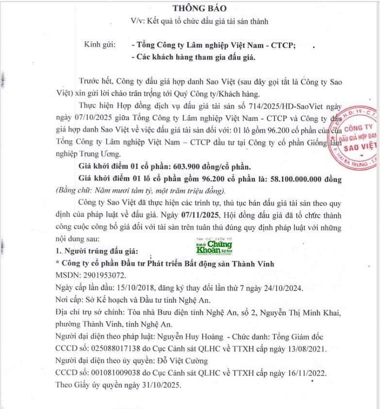 Công ty CP Đầu tư Phát triển Bất động sản Thành Vinh vừa mua trọn 96.200 cổ phần mà Tổng công ty Lâm nghiệp Việt Nam – CTCP (Vinafor) đưa ra đấu giá tại Công ty CP Giống lâm nghiệp Trung ương (SFS). Số cổ phần này tương đương 48,1% vốn điều lệ và giúp Vinafor thu về hơn 58 tỷ đồng, với giá trúng bình quân lên tới hơn 604.000 đồng#cổ phần. Sau giao dịch, Thành Vinh trở thành cổ đông lớn thứ hai tại SFS sau Công ty Địa ốc Việt Hân - đơn vị đang nắm 51,65% vốn.<#p>Bất động sản Thành Vinh mua trọn lô cổ phần từ Vinafor<#figcaption><#figure>