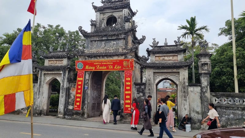 Khuôn viên rộng khoảng 6.000m² gồm tam quan, lầu chuông, lầu khánh, tả vu, hữu vu và khu nội tự kiến trúc chữ Tam. Tam quan chồng diêm hai tầng tám mái là công trình đặc sắc, trở thành biểu tượng kiến trúc tiêu biểu của tỉnh Hưng Yên. Ảnh: Hồng Vũ