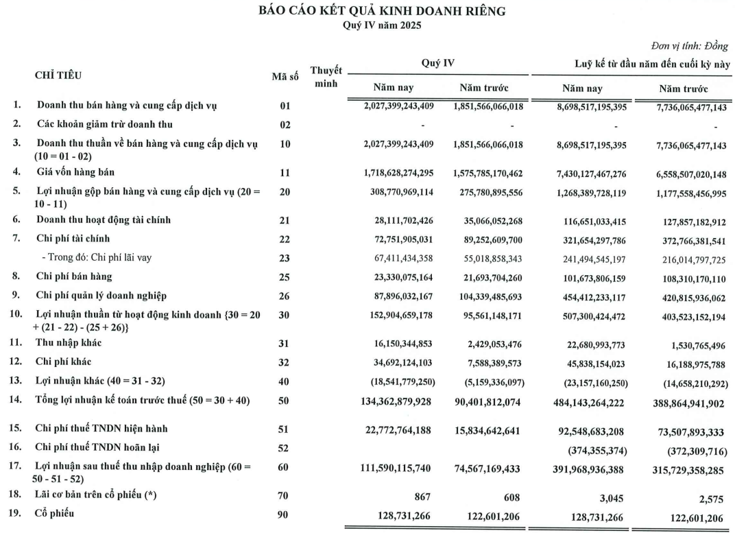 Riêng quý IV/2025, doanh thu của TNG đạt 2.025 tỷ đồng, tăng hơn 9% so với cùng kỳ năm trước. Lợi nhuận sau thuế đạt gần 112 tỷ đồng, cao hơn khoảng 1,5 lần so với quý IV/2024. Dù con số này thấp hơn mức đỉnh ghi nhận trong hai quý liền trước, kết quả kinh doanh quý cuối năm vẫn đóng vai trò then chốt, giúp doanh nghiệp hoàn tất một năm tài chính được xem là tích cực nhất trong lịch sử hoạt động.
